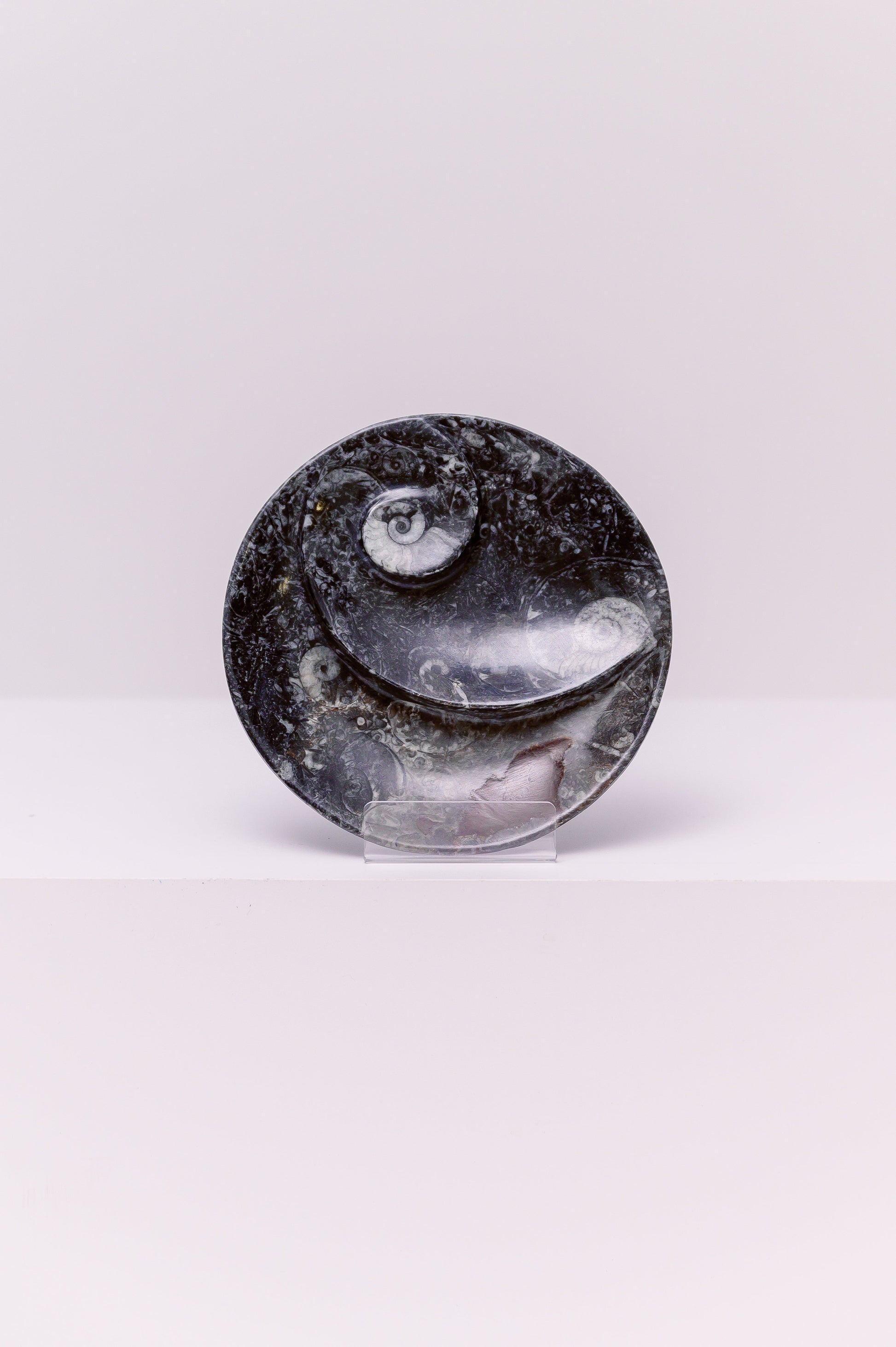 This polished, hand-carved dish is a unique piece of natural history and home decor. Crafted from a dark, fossil-rich stone, it features prominent, embedded fossils of ancient marine life. This decorative plate showcases the intricate beauty of these extinct cephalopods, which lived in the oceans millions of years ago. Ideal for display, this dish is a conversation starter and a testament to the Earth's ancient past.
