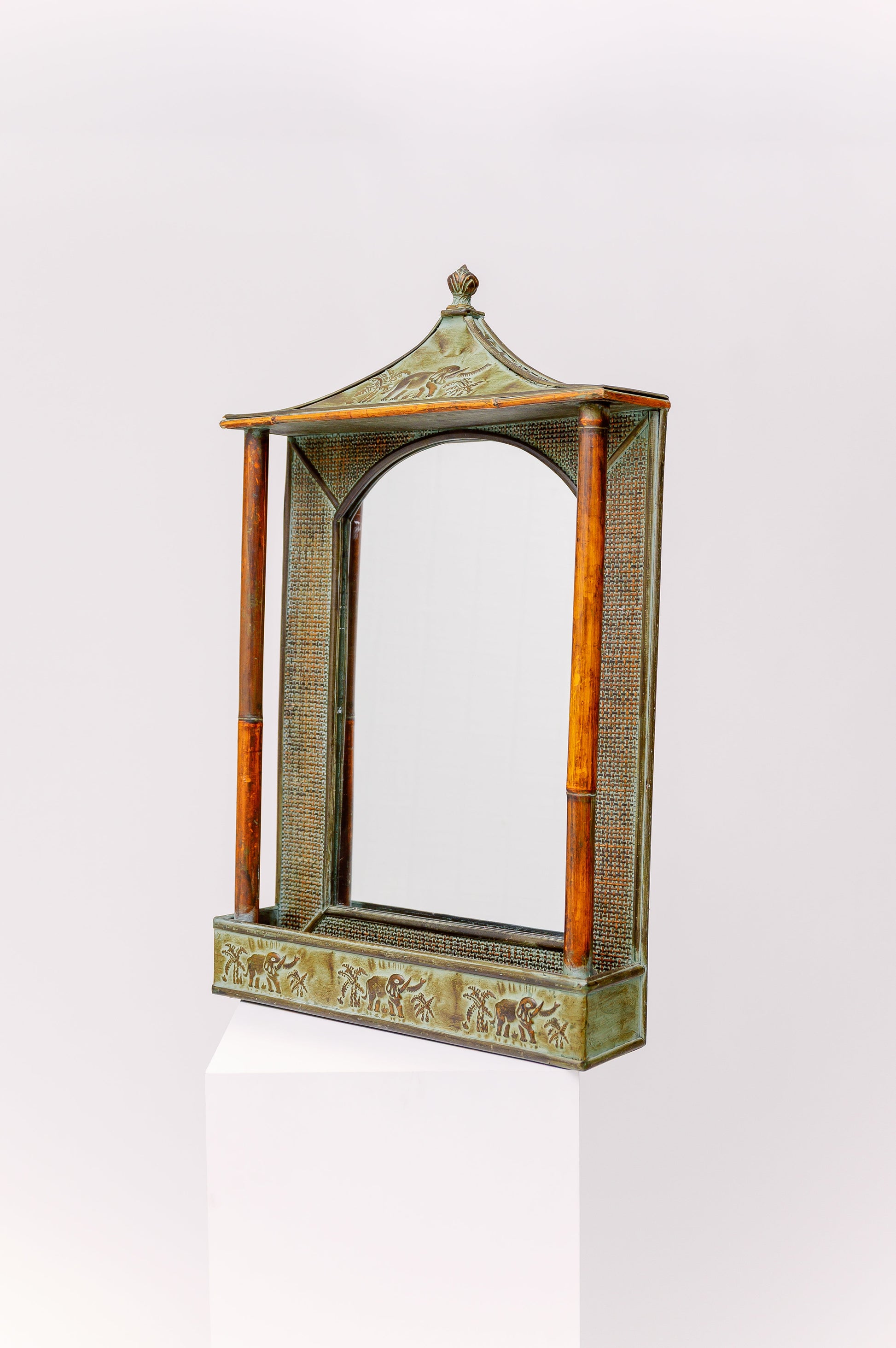Vintage elephant pagoda mirror with bamboo and rattan details, and storage space in the bottom.