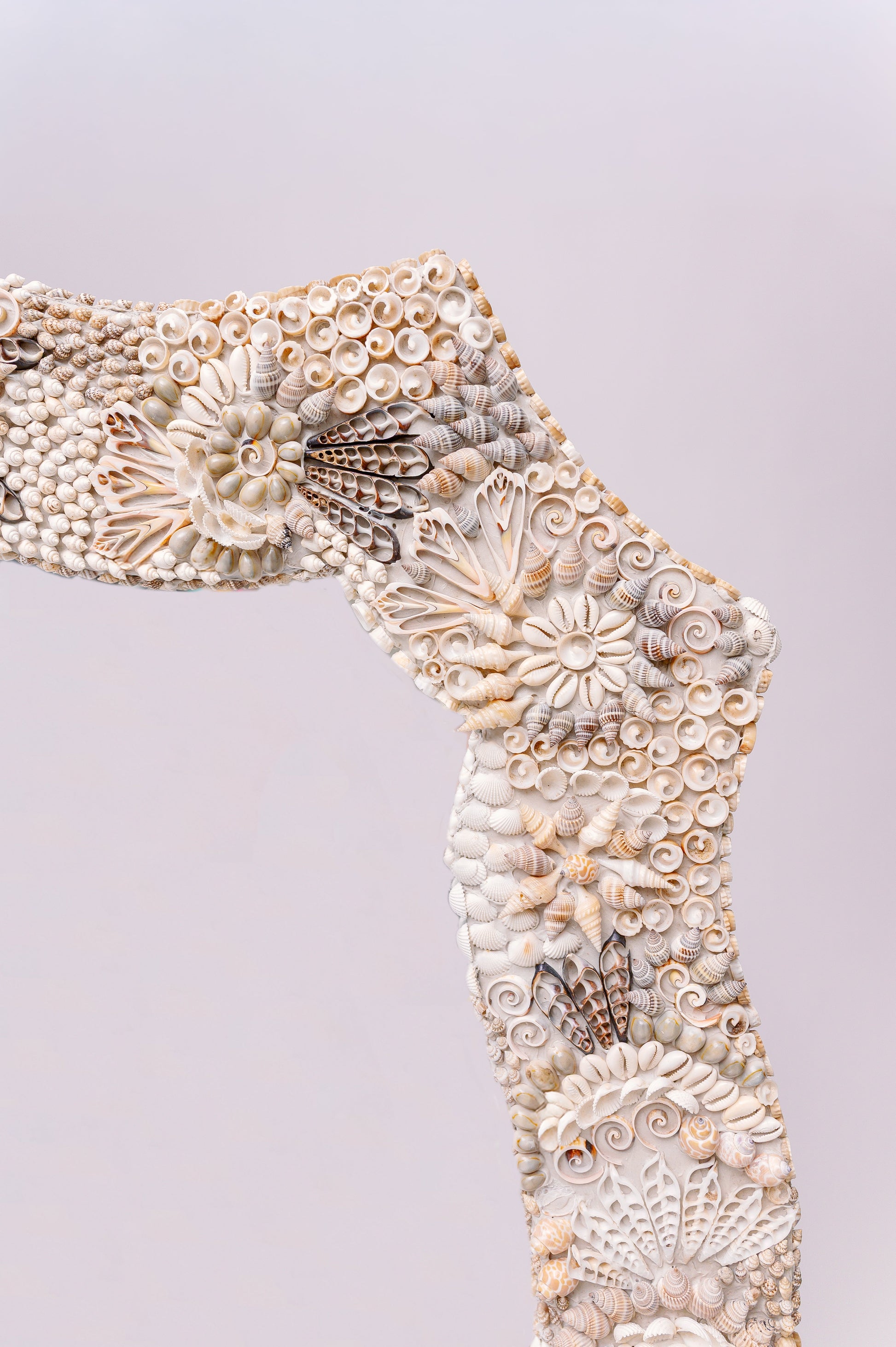 This beautifully ornate mirror frame features intricate detailing made from seashells, arranged in floral and geometric patterns.