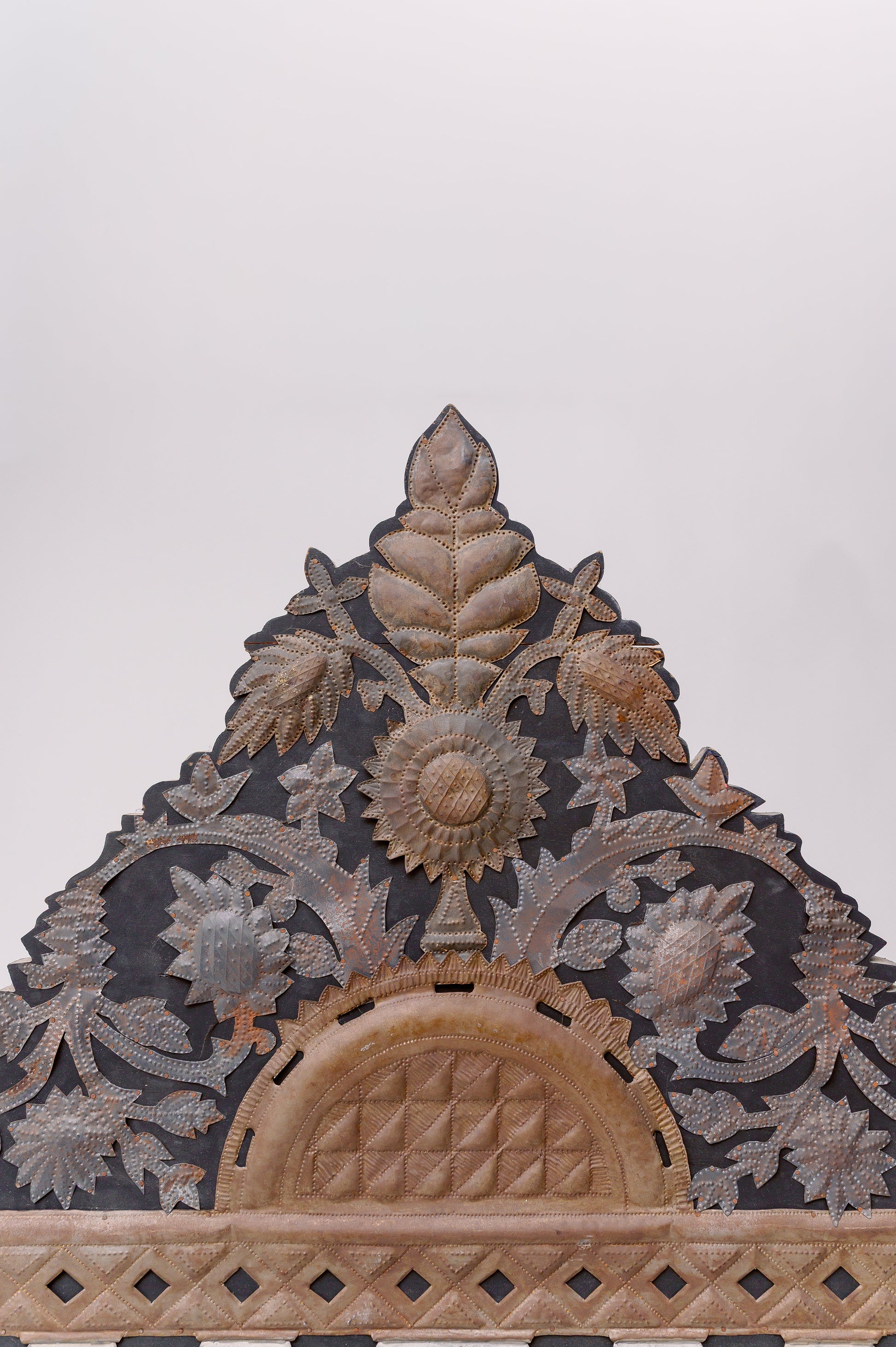 Translating to "the ancient vine", this large tin adorned mirror features intricate carvings of florals, animals and geometric shapes.
