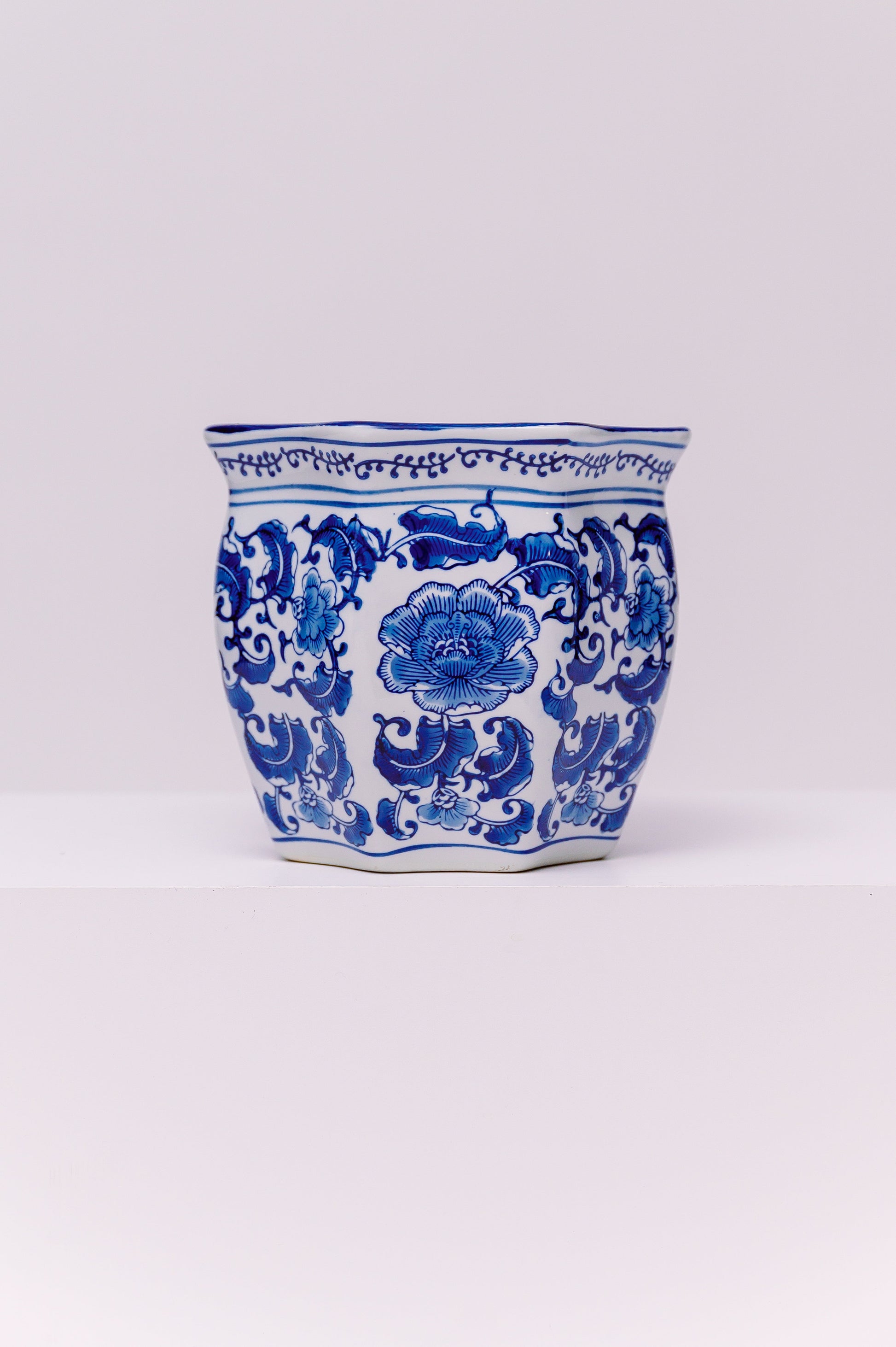 This square-form porcelain planter is hand-painted in underglaze cobalt blue, featuring scrolling peonies and stylized foliage. The peony, known as the “king of flowers,” is a traditional Chinese symbol of prosperity, honor, and wealth. The vessel’s gently flared rim and paneled body create a refined silhouette, while the continuous floral pattern enhances its decorative appeal.